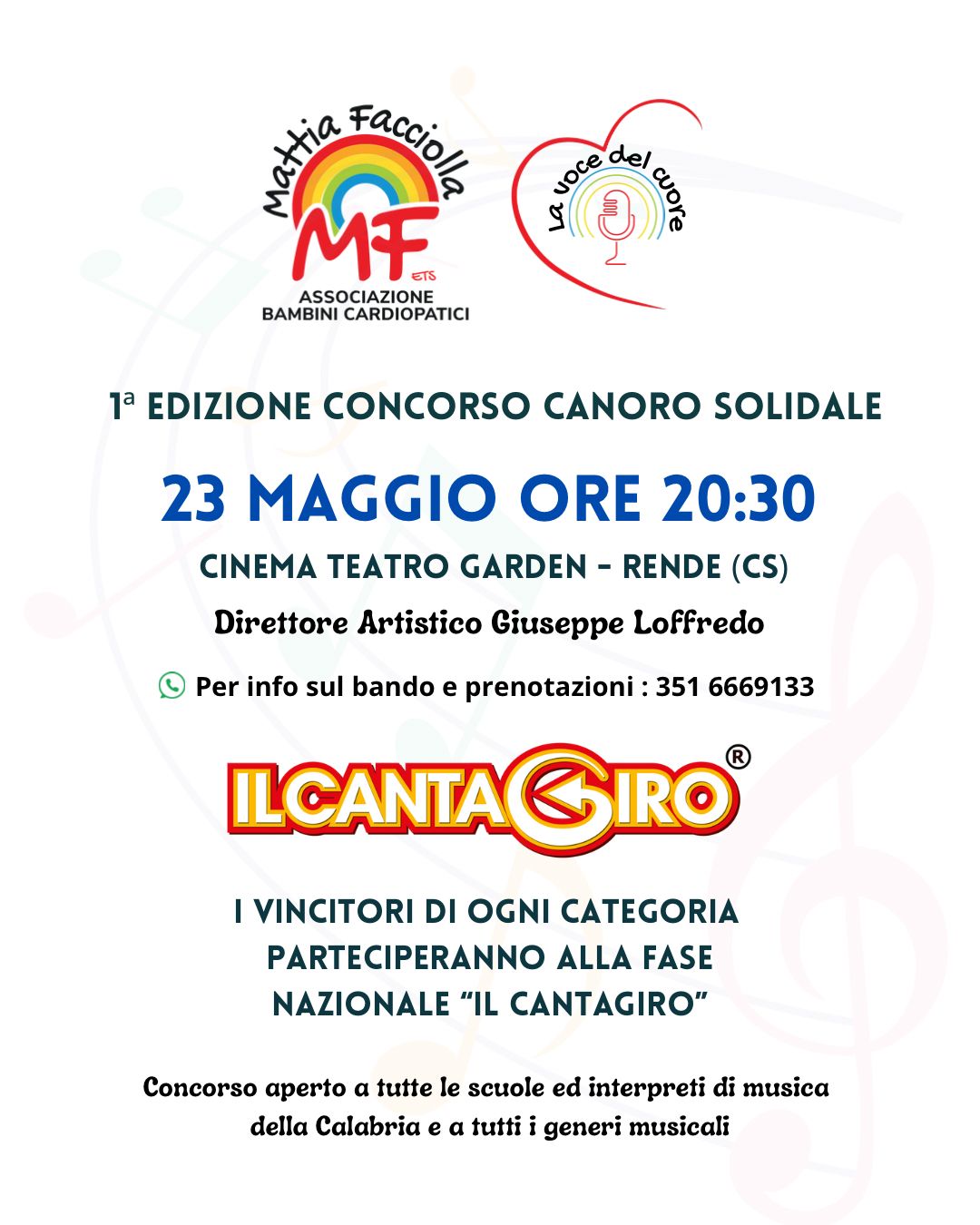 La musica incontra la solidarietà nella prima edizione del concorso canoro solidale organizzato dall’Associazione Mattia Facciolla Bambini Cardiopatici ETS. L’evento si terrà presso il Cinema Teatro Garden di Rende, il 23 Maggio 2025, offrendo a giovani e adulti un’opportunità unica per esprimere il proprio talento e contribuire a una nobile causa.