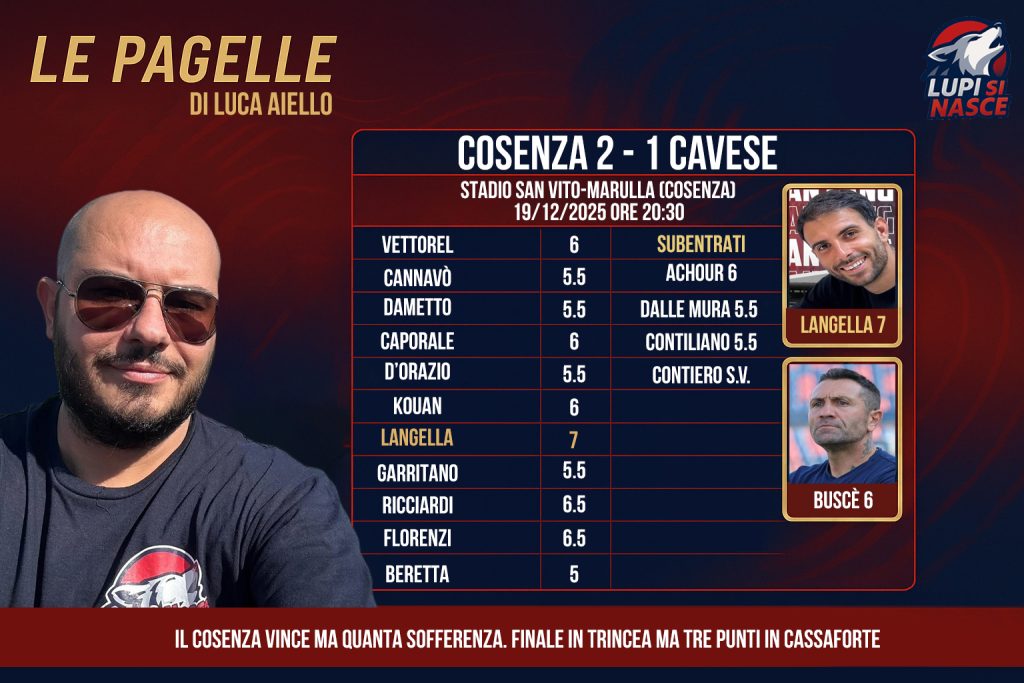 All’avvio subito importante occasione per il Cosenza con un gran tiro di Garritano respinto da Boffelli con non poche difficoltà. Il 10 rossoblù aveva raccolto una conclusione contrata di Florenzi servito bene da Ricciardi dal fondo. Al 7′ minuto il Cosenza va in vantaggio: Langella realizza con un gran destro in diagonale chiudendo un’azione che lui stesso aveva fatto partire con un gran recupero in mediana e passata per la ruleta di Florenzi e l’assist di Ricciardi. Squillo della Cavese al 13′: stacco di testa di Amerighi su traversone di Maiolo e Vettorel che, senza correre rischi, mette in corner. Al 28′ si strozza l’urlo in gola a Sorrentino che aveva segnato il gol del pari ma è prontamente annullato per un fallo antecedente di Amerighi su D’Orazio. Al 30′ Prosperi si gioca la card dell’FVS per richiedere un rigore per presunto fallo di Dametto sul Guida. A seguito della revisione al monitor il direttore di gara conferma la sua decisione iniziale. Il primo tempo scorre verso la fine senza particolari emozioni. Nell’intervallo Buscè sostituisce un evanescente Beretta con Achour e si riparte. Al 53′ Boffelli regala il raddoppio al Cosenza non riuscendo a bloccare quello che era praticamente un appoggio di Kouan dalla distanza. Esultanza con bluff per l’ivoriano che simula un infortunio facendo preoccupare compagni e staff prima di scatenare risate e ilarità. Al 59′ deve alzare bandiera bianca sul serio Ricciardi a causa di una violenta caduta, al suo posto Dalle Mura con conseguente cambio di sistema: 3-5-2 con Cannavó e D’Orazio a tutta fascia. Al 70′ terzo cambio per i lupi con il solito Contiliano che rileva Garritano. Qualche secondo dopo Achour avrebbe la grande occasione per arrotondare il punteggio ma, su pregevole assist di D’Orazio, a pochi passi dalla porta, colpisce di testa abbastanza centrale, favorendo la parata del portiere avversario. Ne approfitta la Cavese che accorcia le distanze al 75′ con un grandissimo gol al volo di mancino di Orlando, che sfrutta anche una marcatura un po’ blanda di D’Orazio. I minuti finali sono di sofferenza per i lupi, stremati. All’81’ Prosperi chiede ancora una revisione FVS per un contatto sospetto in area di rigore tra Dametto e Sorrentino. Una leggera trattenuta sembra esserci ma il direttore di gara non la ritiene tale da cambiare la sua decisione. Anche Buscè si gioca una card per possibile espulsione di un avversario ma anche stavolta la revisione si chiude con un nulla di fatto. Dopo sei minuti si chiude il match con il Cosenza che riesce a portare a casa tre punti importantissimi. Ora la sosta prima della ripresa del 5 gennaio. Ci si augura che per quella data il mercato abbia fatto già registrare qualche movimento importante in entrata. Chi vivrà vedrà, per il momento felice Natale.